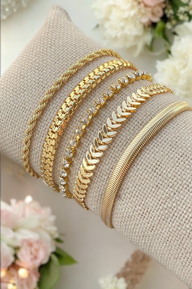 Gold 5 Parçalı Zirkon Taşlı Renk Atmaz Kadın Bileklik Kombini